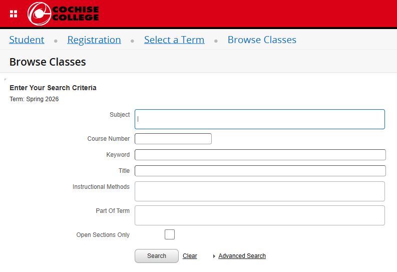 2. On the Browse Classes page you can select a Subject, enter a Course Number, Keyword, or simply click the Search button to view a list of all classes.