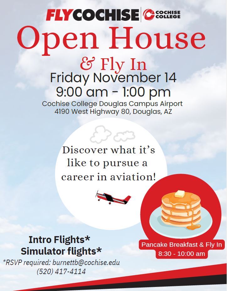 The Cochise College Aviation Department invites the public to its Aviation Open House on Friday, November 14, from 9 a.m. to 1 p.m. at the Douglas Campus, 4190 West Highway 80. Visitors will have the opportunity to explore aviation facilities, test their skills in flight simulators, take an introductory airplane flight and meet students enrolled in the Cadet Programs.